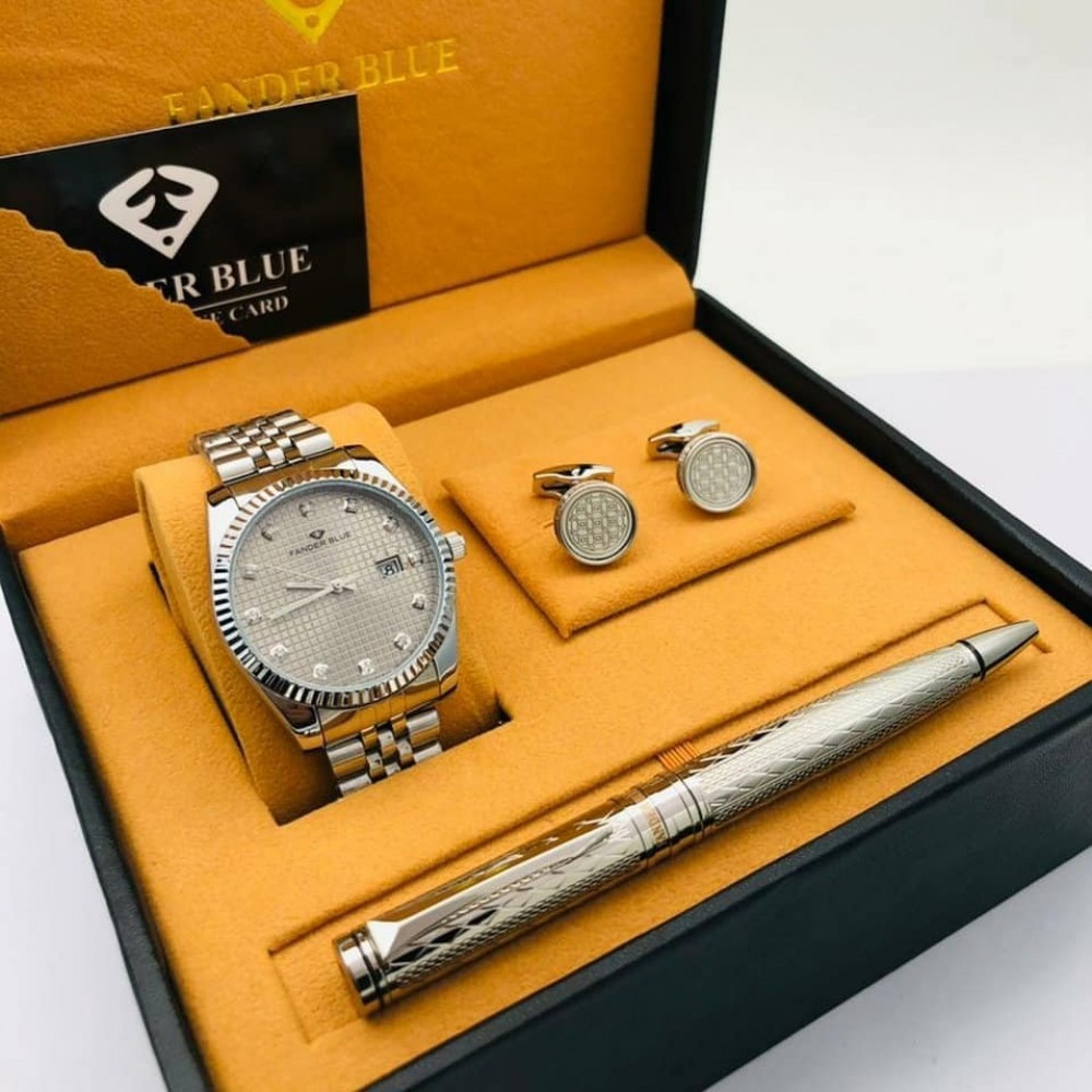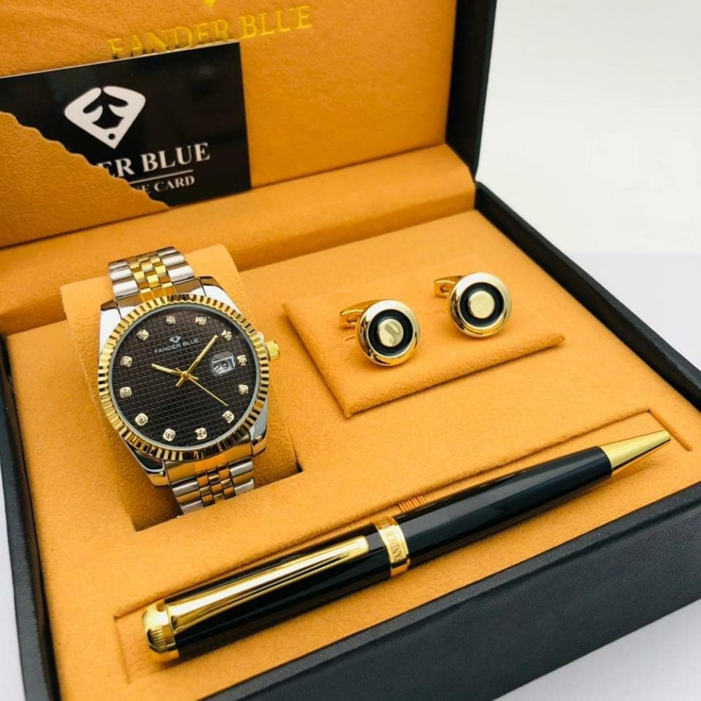 - يتكون الطقم من : (ساعة رجالية راقية - قلم أنيق - كبك - علبة طقم فخمة - كيس كرتوني أنيق).
