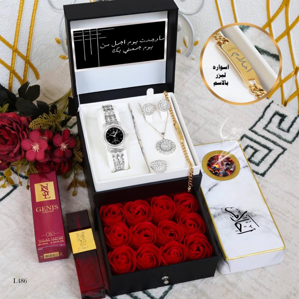 نقدم لكم بكس نسائي راقي يتكون من ساعة سهرة زركون ضمان سنة مكينة ومويا تصميم بالاسم حسب الطلب سلسل زركون حلق زركون سوار استيل بالاسم نحت ليزرعطر ميني فخم بكس راقي ورد مبخرة رخام التصميم حسب الطلب