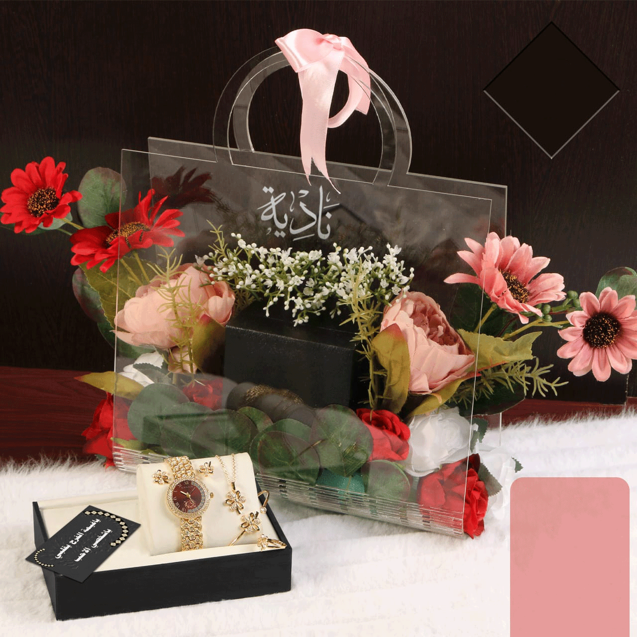 نقدم لكم اطقم نسائية راقية تتكون من : ساعة سهره نسائيه مرصعه بالفصوص سنه ضمان يشمل الماء والمكينهطقم اكسسوار زاركون مكون من 5 قطعبوكس تقديم هديه تصميم خاص مصنوع من الاكرليك يمكن اضافه اسم او عباره حسب الطلب